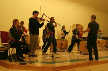 Artistic Director Mark H. Rooney leads Odaiko New England members with Beth Lowe on cello, guest artist Yael Bat-Shimon on violin, and David Wiggins on vocals during a rehearsal for the group's upcoming anniversary concert. Scott Phillips/The Epoch Times