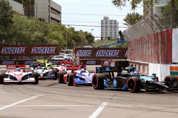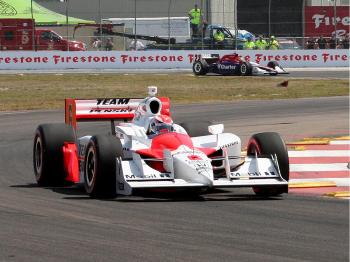 The field streaked down the front straight at speeds approaching 180 miles per hour, heading towards turn One, a fifty-mile-per-hour right-hander. Justin Wilson squeezed past Rahal, and Dario Franchitti followed him through. The cars were four wide at the entry to turn One; however, the racing line proved to be a bit narrower.