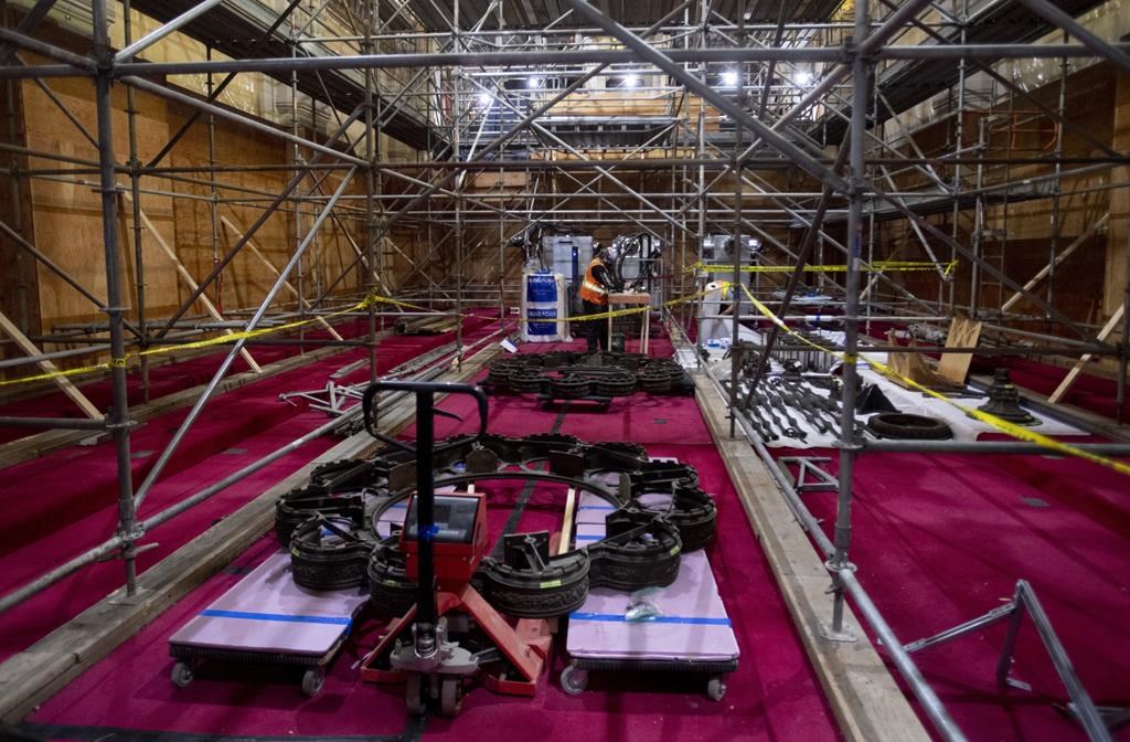In the House of Commons, the hand−painted linen ceiling has been taken down and put in storage, while the Senate’s collection of First World War paintings are at the Canadian War Museum. The two chambers are filled with scaffolding leading up to their respective ceilings.