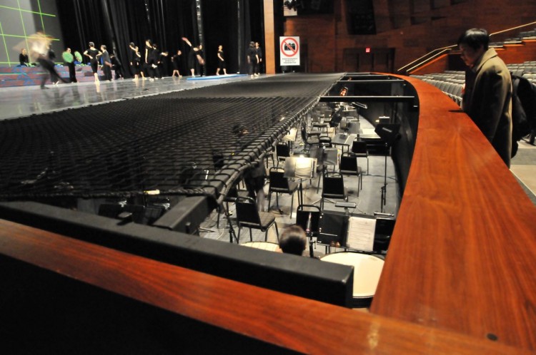 Any break in this chain can make the challenging moves performed by the Shen Yun dancers unsafe. The net installed by the theatre and its support beams block the conductor’s vision, making vital cues and communication nearly impossible.