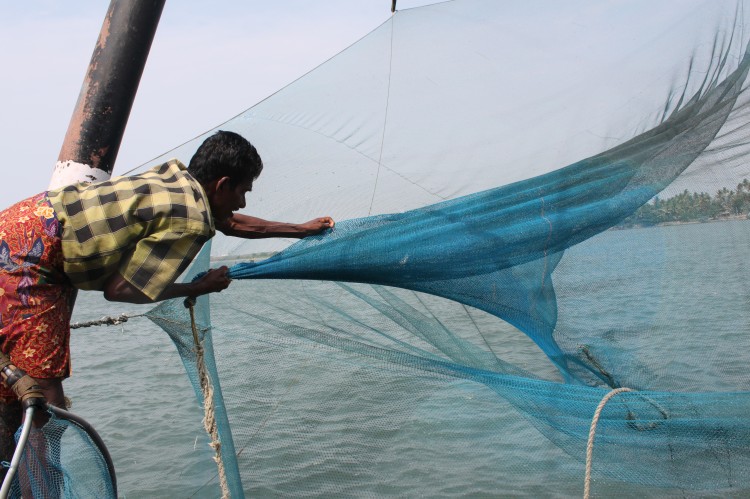 Alochey, the owner of a Chinese fishing net in Fort Kochi, watched while his five workers operated the net. The men worked in a kind of frenzy, pulling down ropes to which counter-weight boulders were tied. The catch: a small, lone fish.