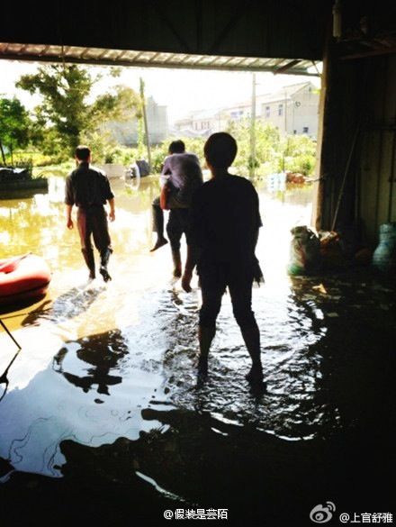 A 60-year-old villager in Zhejiang Province carried a communist official wearing leather shoes to prevent them getting wet, while visiting an area severely affected by flooding after Typhoon Fitow.