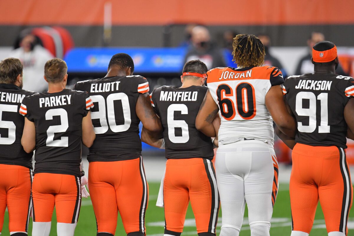 The Browns and Bengals’ Thursday display seemed to mimic a similar act one week earlier when the Kansas City Chiefs and Houston Texans linked arms after the anthem at Arrowhead Stadium.