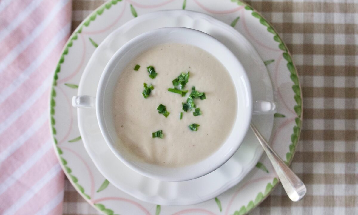 I like serving it in consommé cups (those are the cups with two handles) and garnishing it with chopped chives just before serving. Similar to vichyssoise, this soup is delicious served hot or chilled.