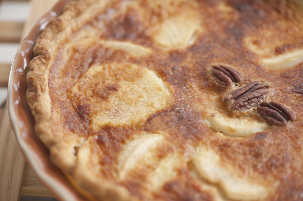 Fall has just begun and that holds true too for pear season. For a holiday treat consider this pie, which combines the sweetness of pears and the creaminess of custard made from eggs, yogurt, and brown sugar.