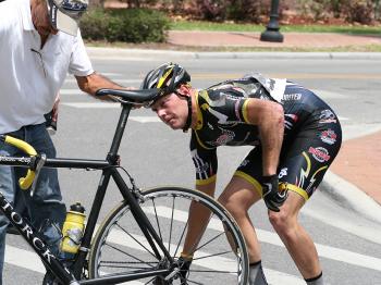 Unworried about possible injury, the rider is disappointed because he lost time. (James Fish/The Epoch Times)Riders were clocked by radar at 26 mph around the tightest corner of the course. Still, they race shoulder-to-shoulder. (James Fish/The Epoch Times)After seeing the speed and intensity of the Juniors races early in the morning, it was hard to imagine the pros could offer more. (James Fish/The Epoch Times)The Juniors riders attacked the corners with the same intensity as the pros would later in the day. (James Fish/The Epoch Times)Neal Shepherd (purple) bears the marks of a recent crash. He said later, 'The pain of a crash is nothing compared to the pain of pushing yourself in the race.' (James Fish/The Epoch Times)Patrons at a local café watch racers whiz by ten feet away. (James Fish/The Epoch Times)The Masters riders (35-55 years old) showed incredible levels of fitness and skill. (James Fish/The Epoch Times)The Masters riders raced close and hard. (James Fish/The Epoch Times)A large field of riders turned out for every race. (James Fish/The Epoch Times)Blaine Van Munn (rear) watches the race from the comfort of his recumbent cycle. (James Fish/The Epoch Times)One of the few times a rider can safely ignore a 'Stop' sign. (James Fish/The Epoch Times)A Women's rider pushes herself midway through the race. (James Fish/The Epoch Times)This rider competed in Juniors, Women's, and Pro 4&5 races. (James Fish/The Epoch Times)This rider puts her head down and pulls hard, trying to hold off the competition. (James Fish/The Epoch Times)The Pro 4&5 field included Juniors and Women's riders, creating a lot of traffic and a lot of action. (James Fish/The Epoch Times)The The First Annual Chain of Lakes Cycling Classic exceeded its organizers’ expectations. More riders than the Cycling Classics crew counted on, actually registered and raced. The timing and scoring systems—exceedingly high-tech, with radio transponders on each bike, accurate to thousandths of a second—worked flawlessly. Volunteers manned all the traffic barriers to keep cars off the track, while others controlled the flow of pedestrians safely across the course. The races went off according to schedule, the racers had all the support they needed, and the competition was fierce.