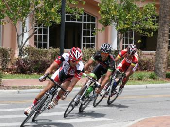 Central and Fifth is always a busy intersection, but only rarely do vehicles pass it so quickly. (James Fish/The Epoch Times)Different riders display different attitudes; some seem eager, some suffer, some are focused ahead. (James Fish/The Epoch Times)This three-man breakaway was not able to stay clear of the peloton. (James Fish/The Epoch Times)This rider managed to escape from the peloton late in the race, and won by half a lap. (James Fish/The Epoch Times)The Women's Categories riders were not appreciably slower than the men, and certainly no less competitive. (James Fish/The Epoch Times)Florida's Department of Transportation provided free bike helmets. (James Fish/The Epoch Times)Lisa Baker (L) and Laura Chaikin ffrom the Humane Society show off one of their adorable, adoptable pets. (James Fish/The Epoch Times)Focus and fatigue are visible in the riders' faces. (James Fish/The Epoch Times)The sight of a pack of two dozen cyclists rounding sharp corners at speeds approaching thirty miles per hour is stimulating, to say the least. The riders are within an inch or two of touching each other, leaning into the corners at what seems an impossible angle, only to snap upright and pound on the pedals to accelerate to the next corner.