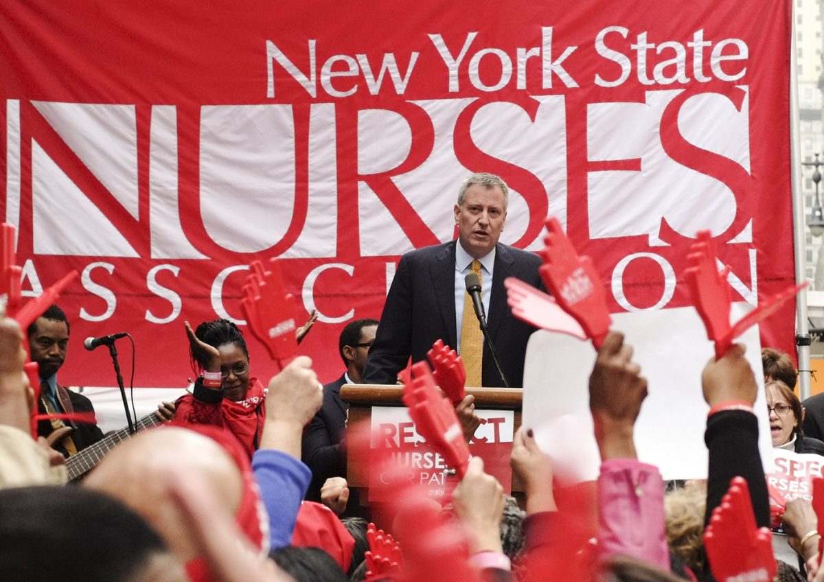 Speaking before a crowd of several hundred nurses, who were in town for their annual nurses convention, de Blasio thanked them for their work and promised to deliver a fair contract if elected on Nov. 5.