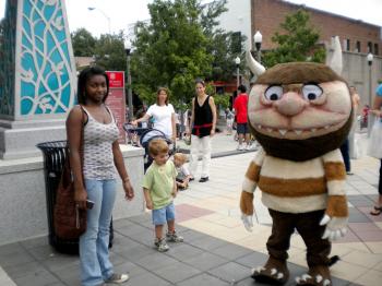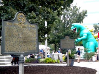 Bookzilla lumbers behind two Civil War markers. Decatur lies east of Atlanta, and saw action before the Battle of Atlanta. (The Epoch Times)Meghan Christian as Sally Canfield, 'The Witch of Montouh.' (The Epoch Times)Marena Debique escorts her sister, Aihlla, who is dressed as a wild thing from Maurice Sendak's 'Where the Wild Things Are.' (The Epoch Times)