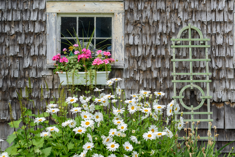The shade of weathered wood against gleaming white or hunter green trim is typical of the vernacular architecture, which ranges from craftsman cottages and barns to neoclassical mansions. The summer landscape is green in all its intensities, from dark, almost black, to striking chartreuse. Several times a year, flowers abound everywhere in bombastic bushels of hydrangeas side by side with tiger lilies and winter cabbage and patches of daffodils, all set against huge, tall evergreens.