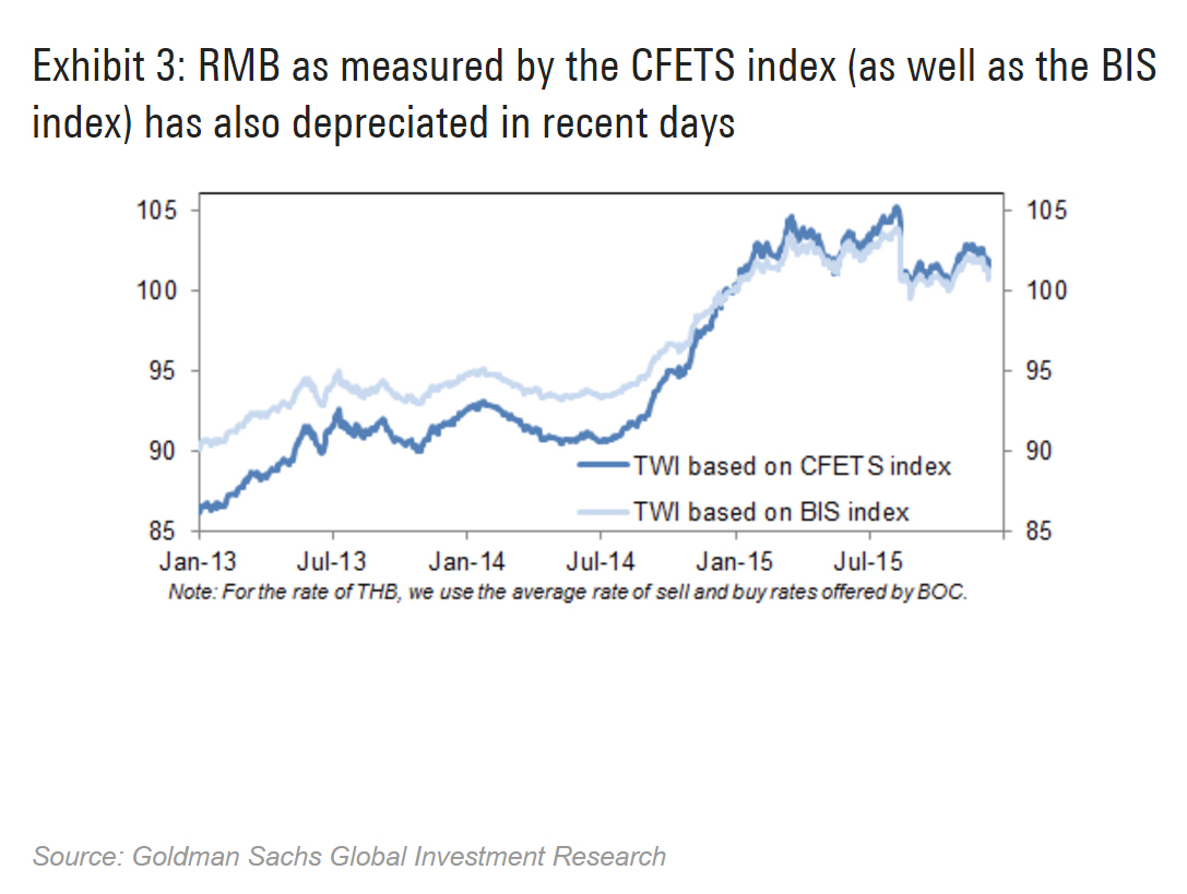 In other words, according to Goldman Sachs, it gives Beijing an excuse to say, “Our currency is very overvalued and we need to depreciate, especially against the U.S. dollar.”