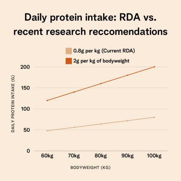 Chart showing daily recommended protein intake vs. a higher intake based on recent research (Ora)The Role of Protein in Weight Loss, Metabolism, and Muscle Building