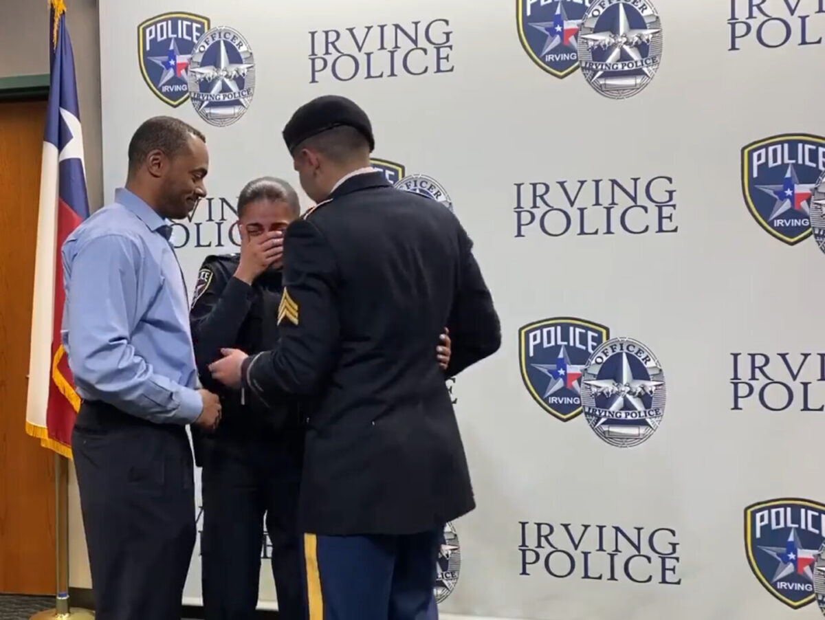 In the video posted on Facebook by the Irving Police Department in Texas, Pando unexpectedly appeared at his mother’s swearing-in ceremony on Friday, Jan. 31, 2020.