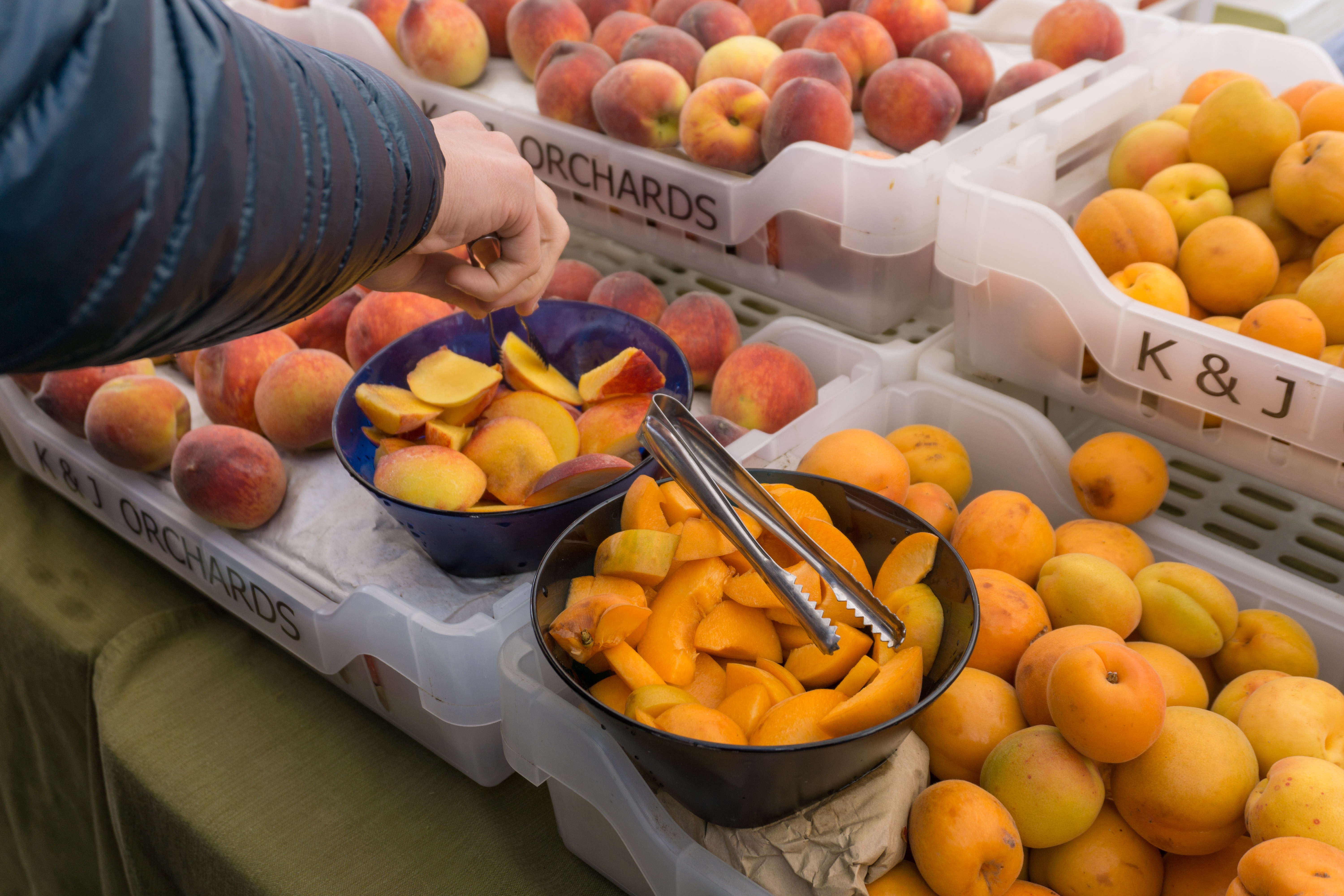 For shoppers, it’s a food wonderland. Hands clamor for chunks of bread smeared with fresh goat cheese or juicy slices of yellow nectarines, and sift through giant piles of produce for the best picks of the day. Brunchers enjoy roti chicken sandwiches or trays of momos, with an unbeatable view of the Bay Bridge.
