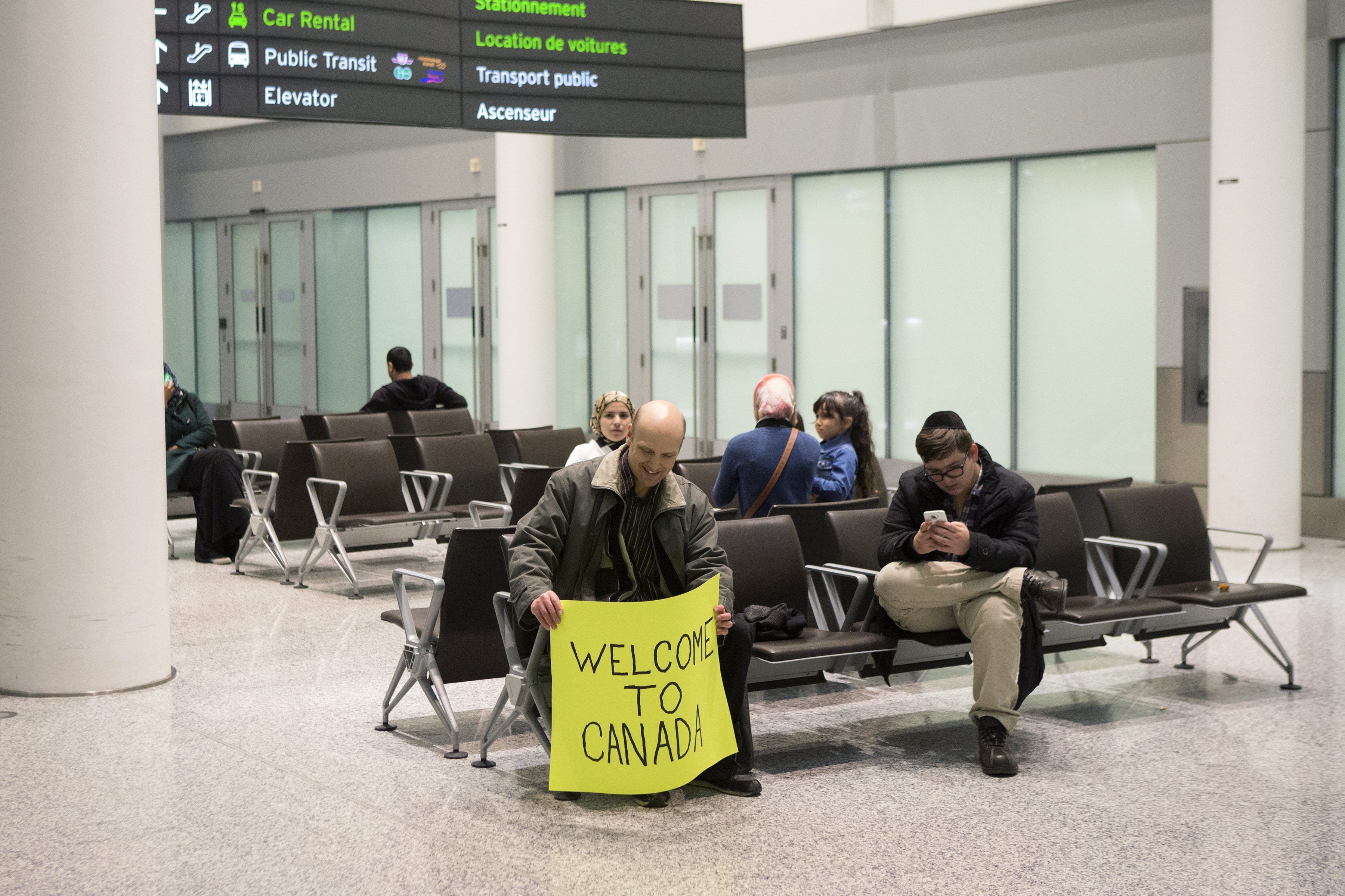 Andrew Harris, 51, said he wanted to counter the fearful messaging about Muslims that has circulated since the Paris attacks. He held up a large yellow sign that read “Welcome to Canada,” saying that even if the arriving refugees don’t see it, the positive words won’t go unnoticed.