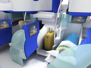 Among the more interesting designs is one specially geared for the business class. It features two floors, with each seat having the potential to become a bed that can be accessed by folding up the arm rest. A small flight of stairs leading up to the second row can be opened to store a briefcase, and the head room on the bottom row is designed so that even the taller passengers will be comfortable.