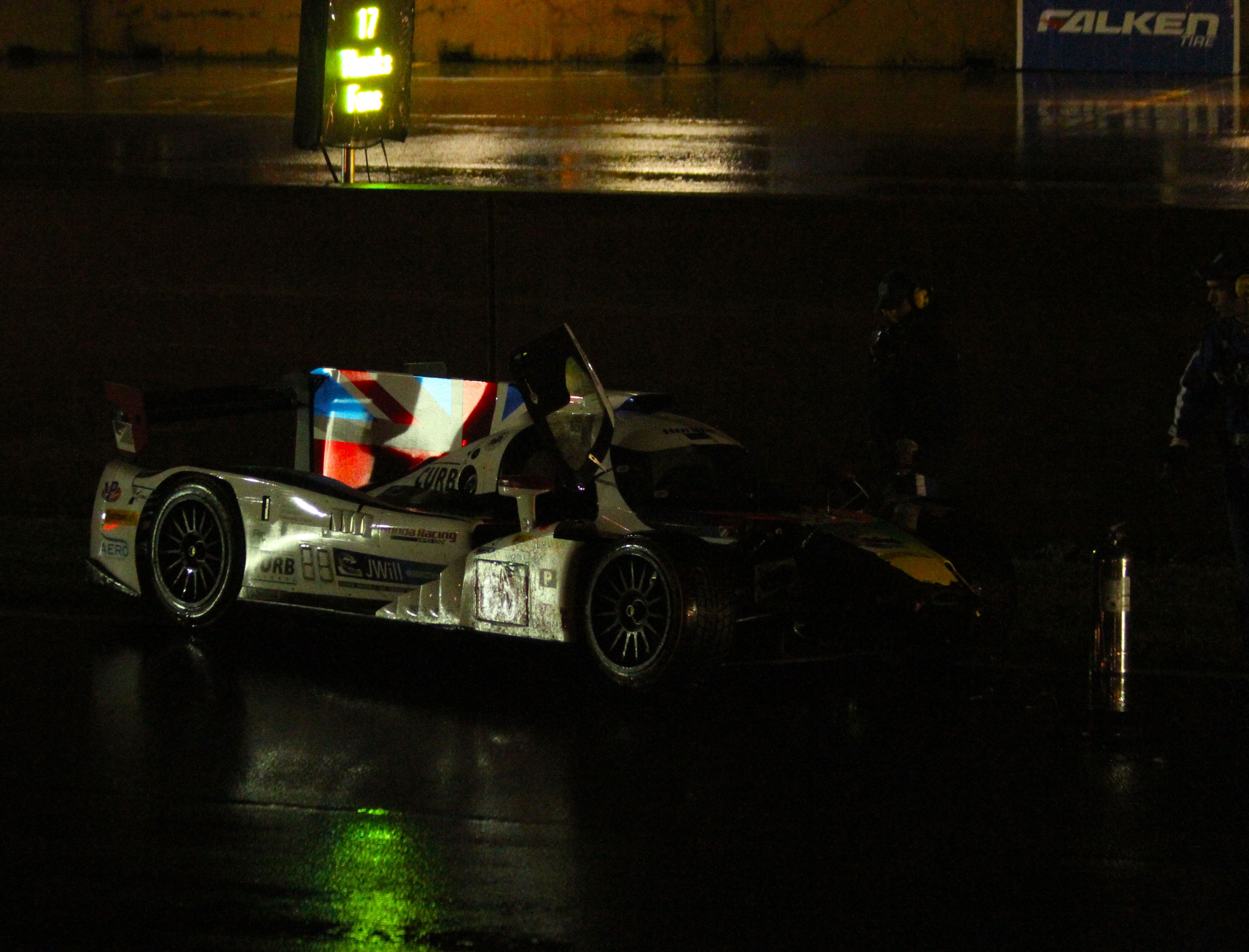 Night practice saw another rain-inspired wreck as John Pew lost control of the #60 Michael Shank Racing Ligier-Honda while storming down the front straight at near maximum speed. He might have hit a puddle which lifted the car off its wheels; in any case, he suddenly hooked hard into the wall. He got out apparently uninjured, and the car looked repairable.