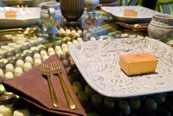 Each room, a chocolate work of art, is inspired by a different collection of Adler’s. The two life-sized statues of a man and a woman in the living room are chocolate recreations of his signature pottery “man” and “woman.” Beneath the glass of the dining table, a chocolate mosaic borrows a signature pattern from his Bargello Collection, while a pillow in the bedroom shares the same pattern.