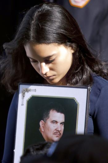 Around the corner retired naval commander Mark Anthony stood beside a bright red truck decorated with graphics and the names of firefighters who lost their lives in the rescue effort.