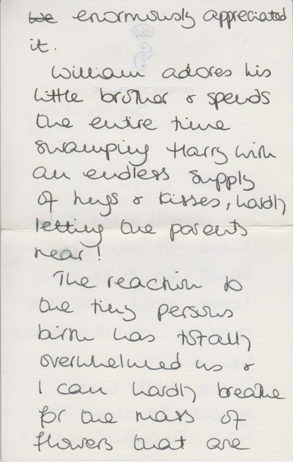 In one, sent five days after Harry’s birth in September 1984, Diana thanked Dickman for a card he sent during what she called “this particularly happy time” and described how affectionate Prince William was toward his baby brother.