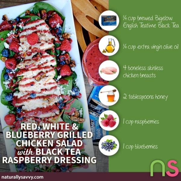 1/4 cup brewed black tea (You can brew more and then use some for the dressing and some for the marinade.) 1/4 cup extra virgin olive oil 1/4 cup red wine vinegar 1 tablespoon honey 3 tablespoons sugar 1 teaspoon lemon juice 1/2 teaspoon Kosher salt 1 1/2 cups raspberries 2 tablespoons blueberriesMarinade Ingredients: