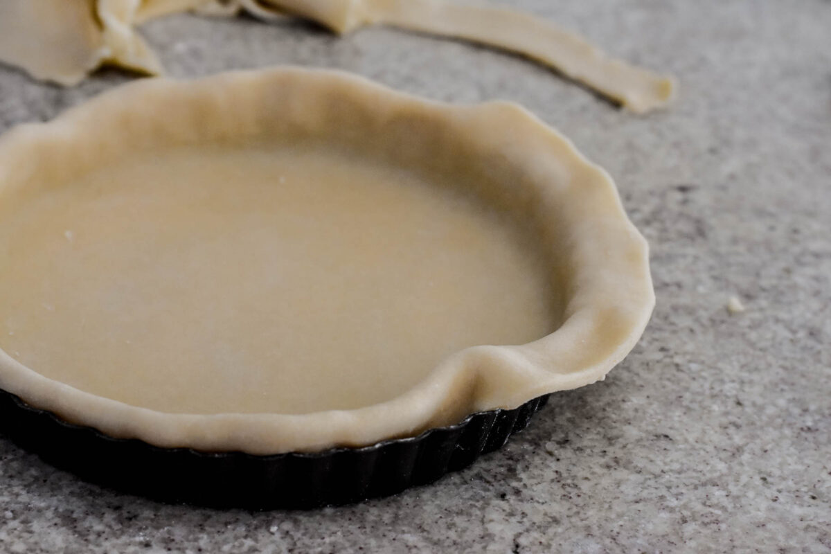 Transfer the crust to the tart pan. Cut any excess crust that hangs over the edges, and poke the bottom of the crust all over with a fork (to prevent it from puffing up when baking)