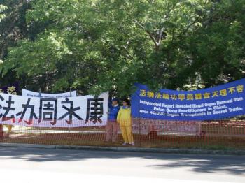 Security for Zhou’s visit was tight and he gave no public statements to the Australian press. Ms Wei said in Canberra on the weekend local Falun Gong practitioners held peaceful protests outside the Chinese embassy, along main roads and outside the Grand Hyatt hotel where Zhou stayed. Ms Wei said that three large buses were used to block the view of the protestors from the hotel. Sources from within the Australian government said that the buses were organised by the Chinese authorities.