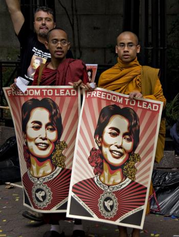 According to the protesters, Aung San Suu Kyi is now on trial on trumped-up charges in “the notorious Insein Prison, ” near Rangoon.