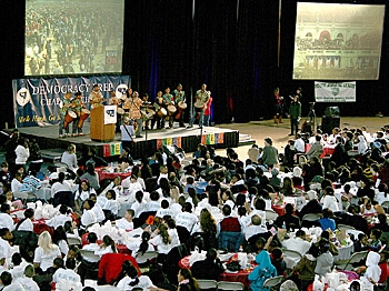 The non-partisan inauguration party included group art projects and performances from participating schools. An African drum team got everyone dancing in their seats and in the aisles and a girl group of rhythmic dancers got the students stomping. Meanwhile the inauguration in Washington D.C played live on three huge digital screens.