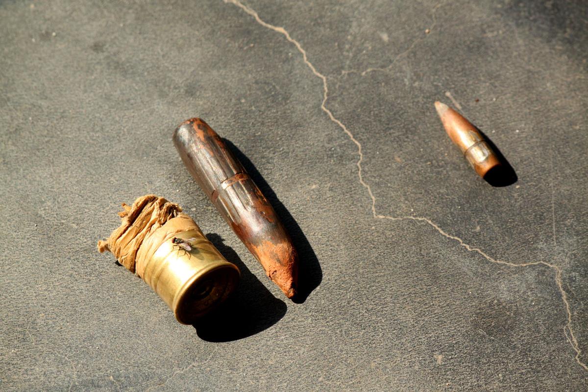 Empty shells from light and heavy weapons fired into Jaoura from across the border with Pakistan. The empty shells were collected by Shankar Chand, whose house’s roof and ceiling were partially damaged in the Aug. 24 firing. Photo taken Aug. 27, 2014. (Venus Upadhayaya/Epoch Times)