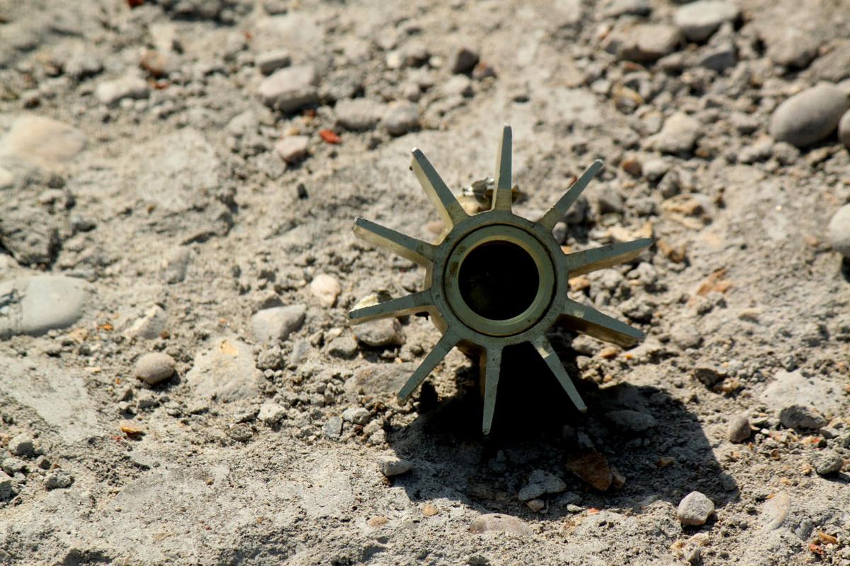 An 81mm mortar shell fired from across the border with Pakistan into the Indian village of Jaoura. The empty shells were collected by Shankar Chand, whose house’s roof and ceiling were partially damaged in the Aug. 24 firing. Photo taken Aug. 27, 2014. (Venus Upadhayaya/Epoch Times)