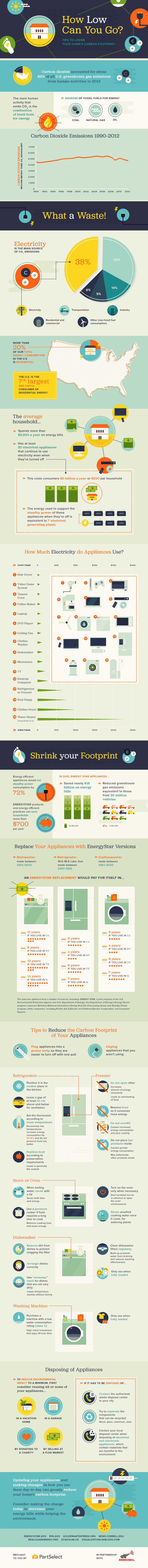 The effort to limit greenhouse gas emissions starts at home. Carbon dioxide accounts for the majority of greenhouse gas emissions, and electricity makes up the largest portion of CO2 emissions. This means that in order to lower your carbon footprint, you must look to the electricity-hungry appliances in your home with a critical eye.