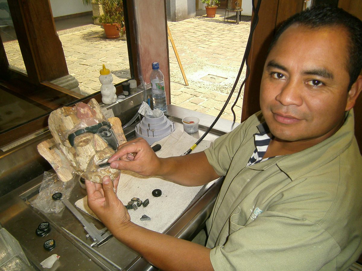 “It takes us 7 days to make this jade mask,” Pascual dePaz said. He and Gustavo Ramirez were working on small pieces of dark green jade that were to be fitted to a wood frame carved to the dimensions and proportions of original burial masks.