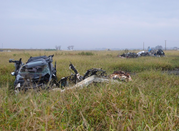 Multistory mounds of neatly separated rubble dot the landscape: mangled cars, toppled electric polls, and the remains of bulldozed houses. The parking lot of an abandoned elementary school is a graveyard of tsunami-chewed motorbikes.