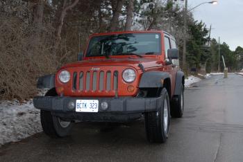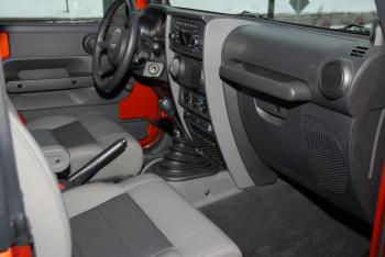 The exterior appearance of the Wrangler has a strong resemblance to what you see in WWII movies. It is, however, a surprisingly big vehicle. Riding on intimidating P255R75R16 tires for the base Wrangler X model, the vehicle measures 72 inches tall. Pulling up behind a Lexus RX330 at a traffic light, I had a good view of its roof from the Jeep driver’s seat. The driver and front passenger would have to literally climb into the seats in the front, and on the 2-door models, getting into the back requires agility for the backseat passengers.