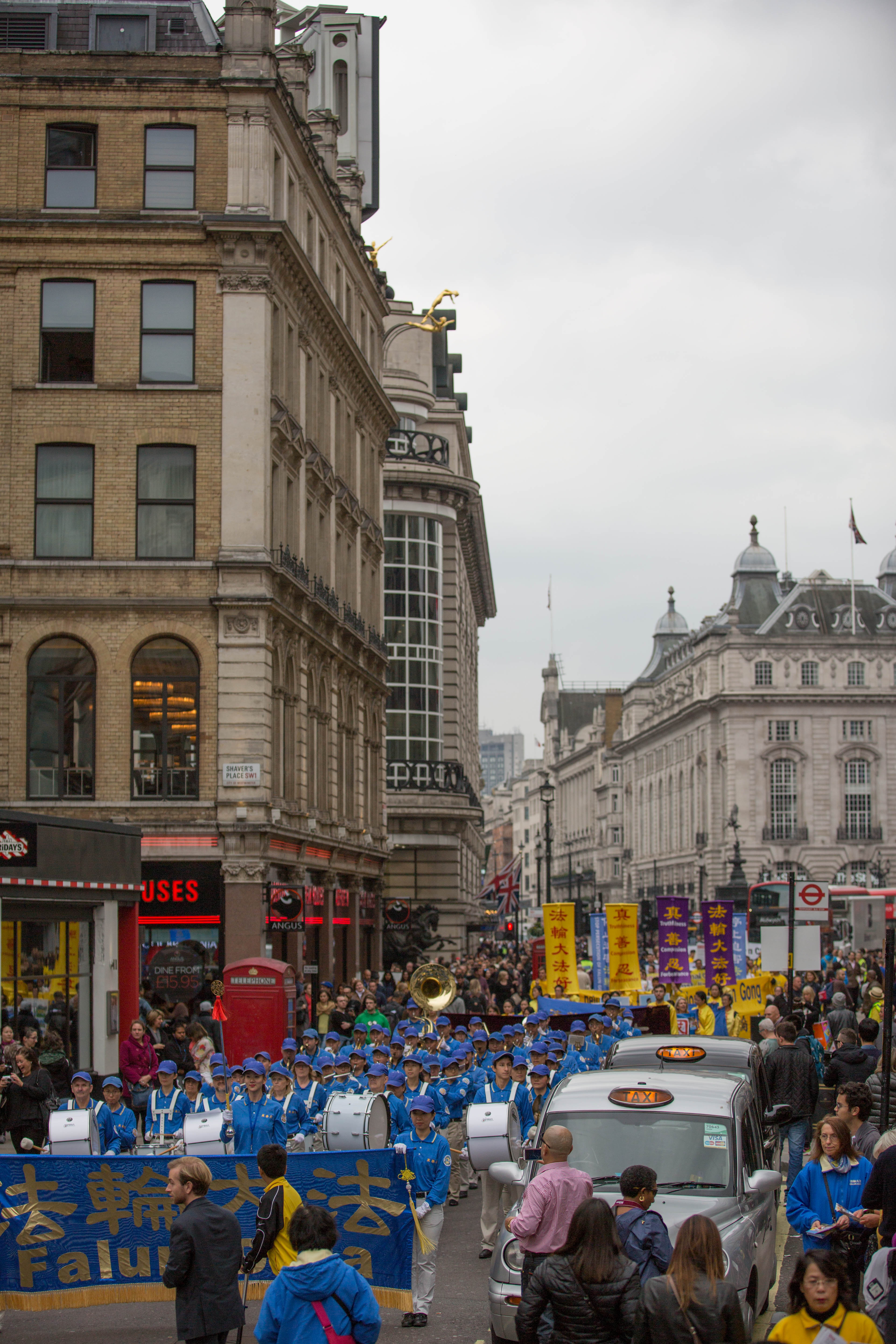 Saturday’s event was organized by Falun Gong practitioners in the U.K. Starting at the Chinese Embassy in central London, the march, headed by a 70-strong band and followed by another 125 people holding banners, placards, and plaques commemorating those who have died in Chinese jails, passed through Oxford Circus, Piccadilly Circus, and Chinatown, and ended in Trafalgar Square.