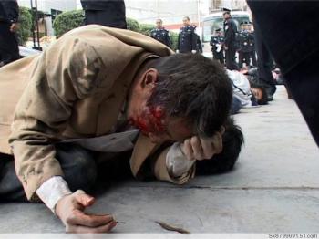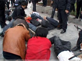People lying on the ground after suffering a beating by the police. (Provided by mainland China Internet users)Longnan City is one of the disaster areas from the May 12 earthquake in Sichuan Province, and post-disaster reconstruction hasn’t yet begun. This has led to the municipal government’s desire to move the city. In a city of 550,000, such a move would likely have a disastrous effect on the financial situation of the local population.