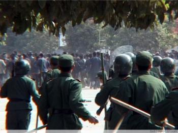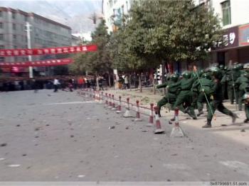 Armed police face off against a crowed of protesters. (Provided by mainland China Internet users)However, more and more pictures have been posted on the Internet by bloggers, showing armed police beating unarmed residents with clubs.