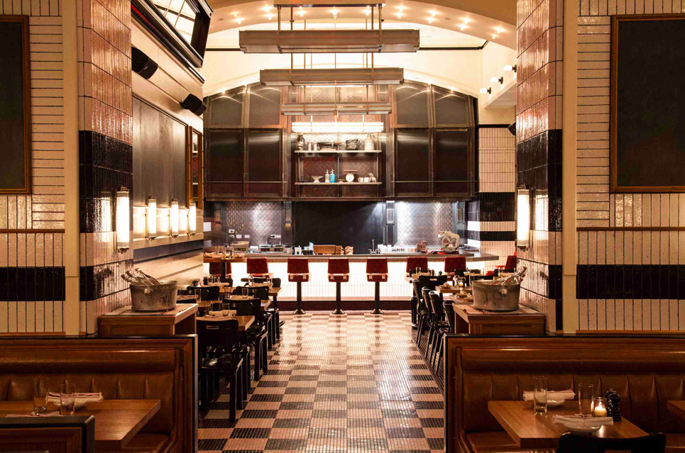 The dining room features a checkerboard floor pattern, black and white glazed walls, leather banquettes, and an open kitchen. The restaurant seats 104.