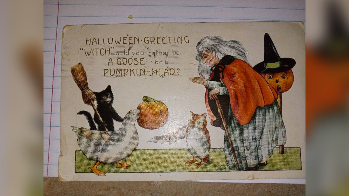 It was signed by someone named Flossie Burgess. The card has a Halloween theme that includes a black cat holding a broom, a bat, a goose, and an owl, along with a woman with a cane and a jack-o’-lantern in a witch’s hat.