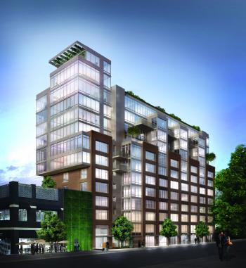 NEW YORK —The first green building on Murray Hill in Midtown Manhattan showcases bamboo, not only with a delicate grove of the plants in the lobby, but also in floors and furnishings. It's just one of the stylish yet practical touches that distinguish 303 E 33rd, which will have 128 units on 12 floors when finished late this year or early 2010.