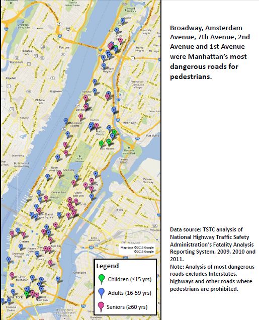 Broadway, which snakes from southern tip of Manhattan through the top of the island (with a small break) is the second most dangerous road in the tri-state region, behind Hempstead Turnpike in Nassau County, according to a new report from the Tri-State Transportation Campaign. Nine people died on Broadway between 2009 and 2011, the years studied in the report.