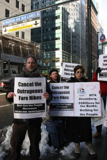 “The MTA (Metropolitan Transportation Authority) should be ashamed of raising the fare after the performance that they just conducted this week,” said Tony Murphy of Bailout the People, a national network that calls for the bailout money awarded banks to be used for social services instead. He was joined by several others on Thursday outside of the MTA office at 347 Madison Ave. to protest the increase of fares for what he calls a degenerating service.