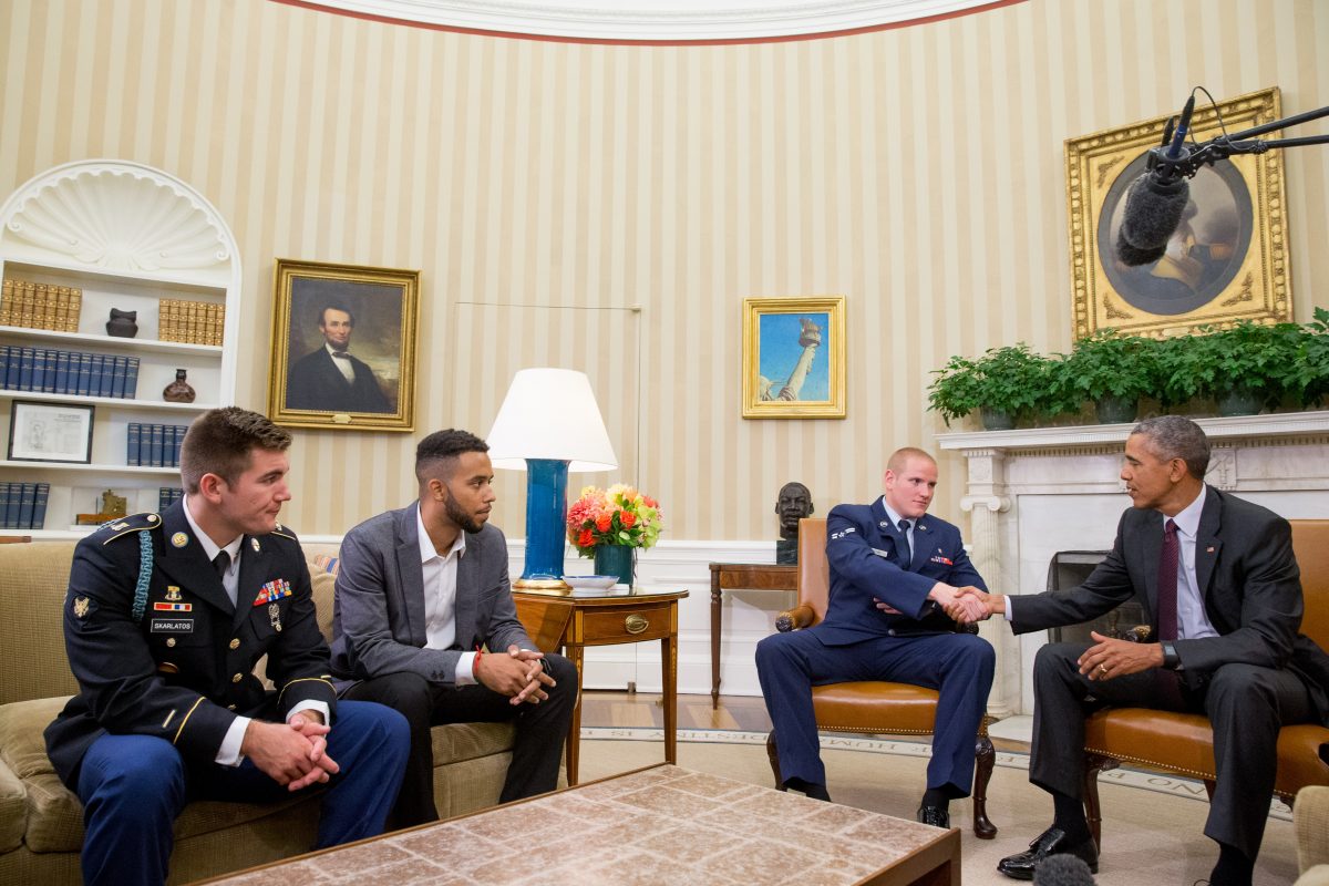 The three sat attentively on an Oval Office couch and chair as Obama praised them as “the very best of America.”