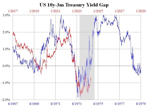 The uncertainty of the timing might be seen from the comparison of the yield gap between now and almost half a century ago (i.e., in 1974). As the accompanying chart shows, the mode and extent of inversion in recent months are highly similar to that in the mid-1970s. As the grey area refers to the recession in that period, if the same applies today, this means we are already in recession and are towards the end of it. However, there is a difference. In the mid-1970s, the yield gap reverted to positive in the middle of the recession, while now the inversion remains intact.