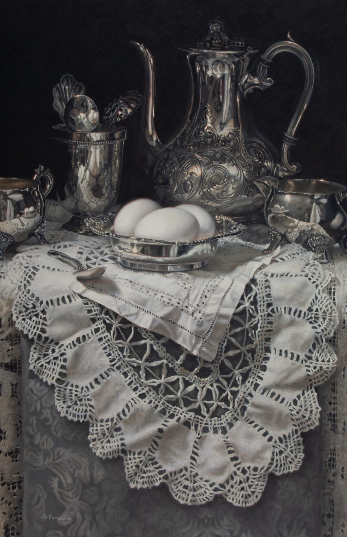 Paterson often gets told that her paintings—full of bygone treasures such as aging lace tablecloths, highly polished silver teapots, and blue-and-white porcelain bowls—remind people of their grandparents’ belongings. It’s one of the reasons why she believes that still-life paintings should be given more credit: The objects in a still-life painting are often familiar to people, whereas portrait paintings of a stranger, which are deemed easier to sell, can be harder to hang in a home, she explained.