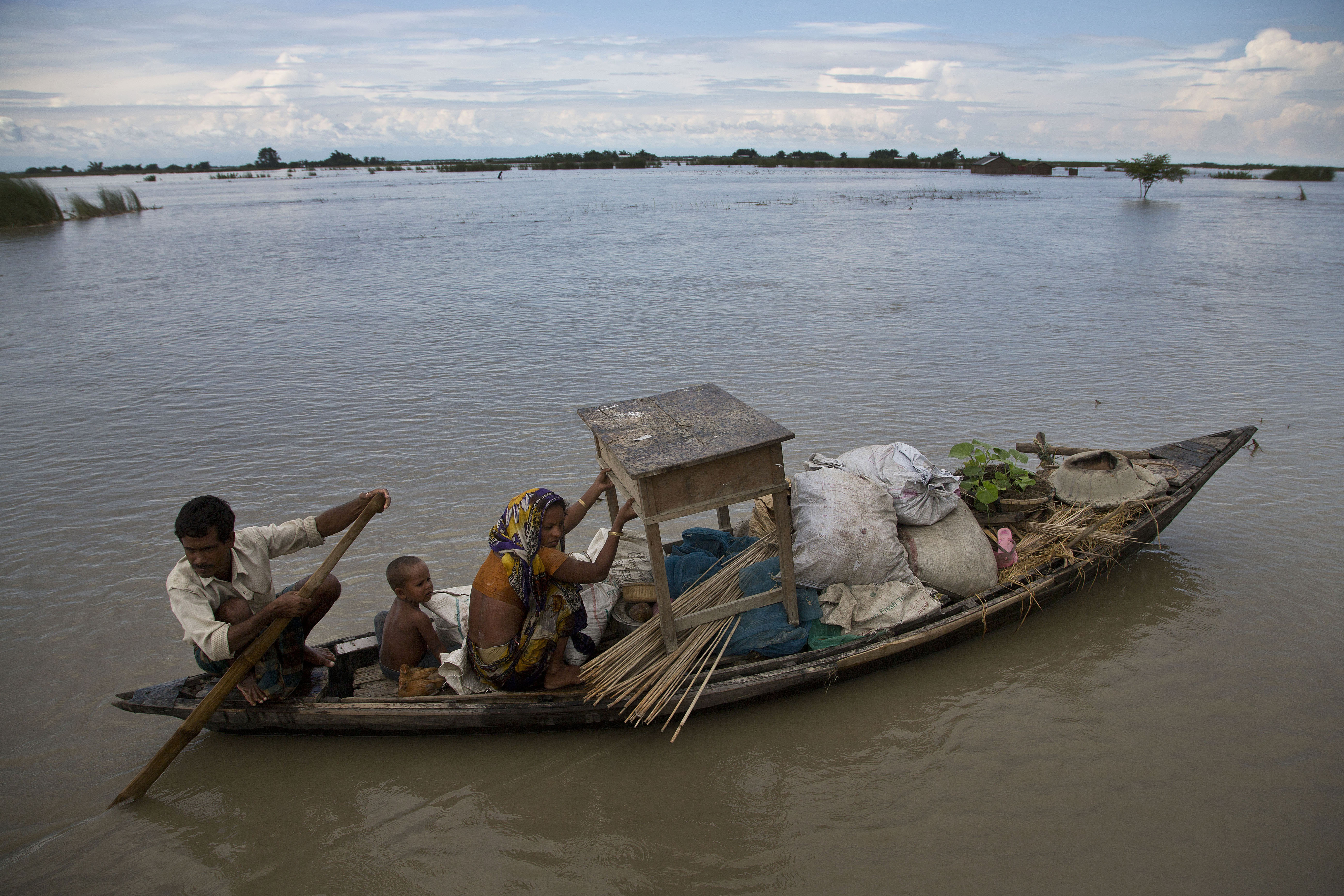 An Indian man carries children and crosses a flooded street as it rains in Mumbai, India, Friday, June 19, 2015. (AP Photo/Rajanish Kakade)