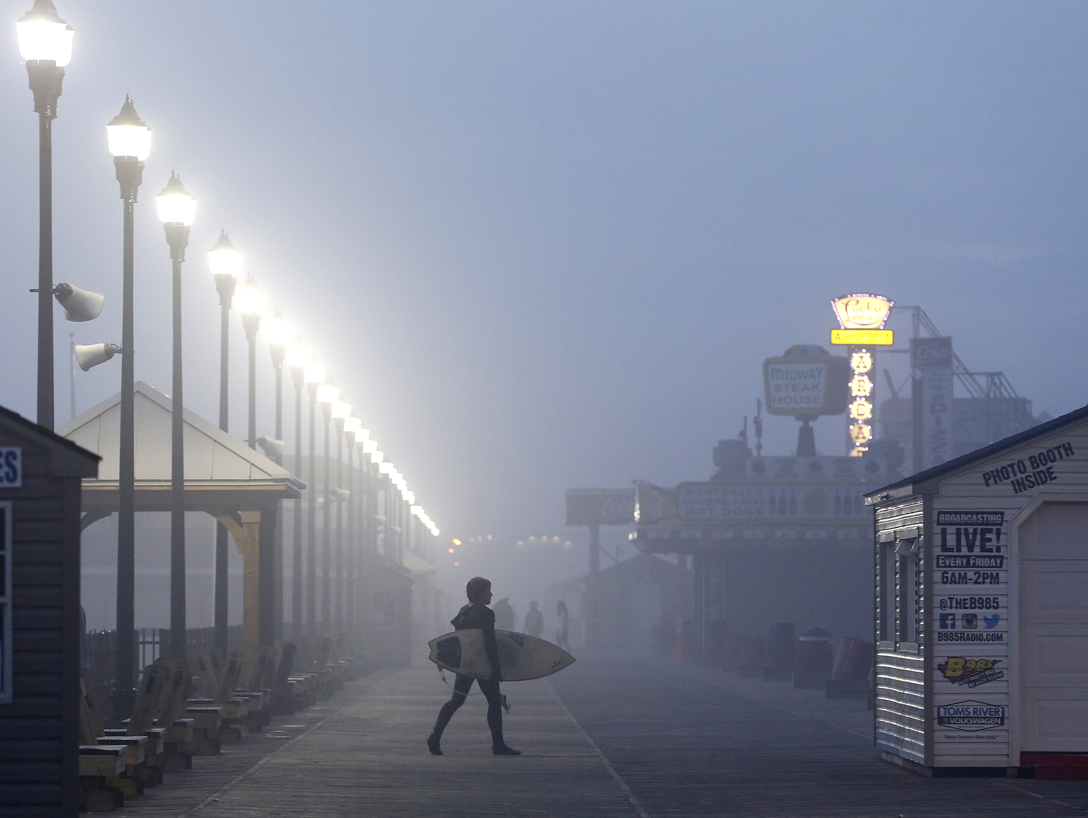 A surfer walks on Casino Pier in Seaside Heights, N.J. on Dec. 24. A weather pattern partly linked with El Nino has turned winter upside-down, bringing spring-like warmth. (AP Photo/Julio Cortez)