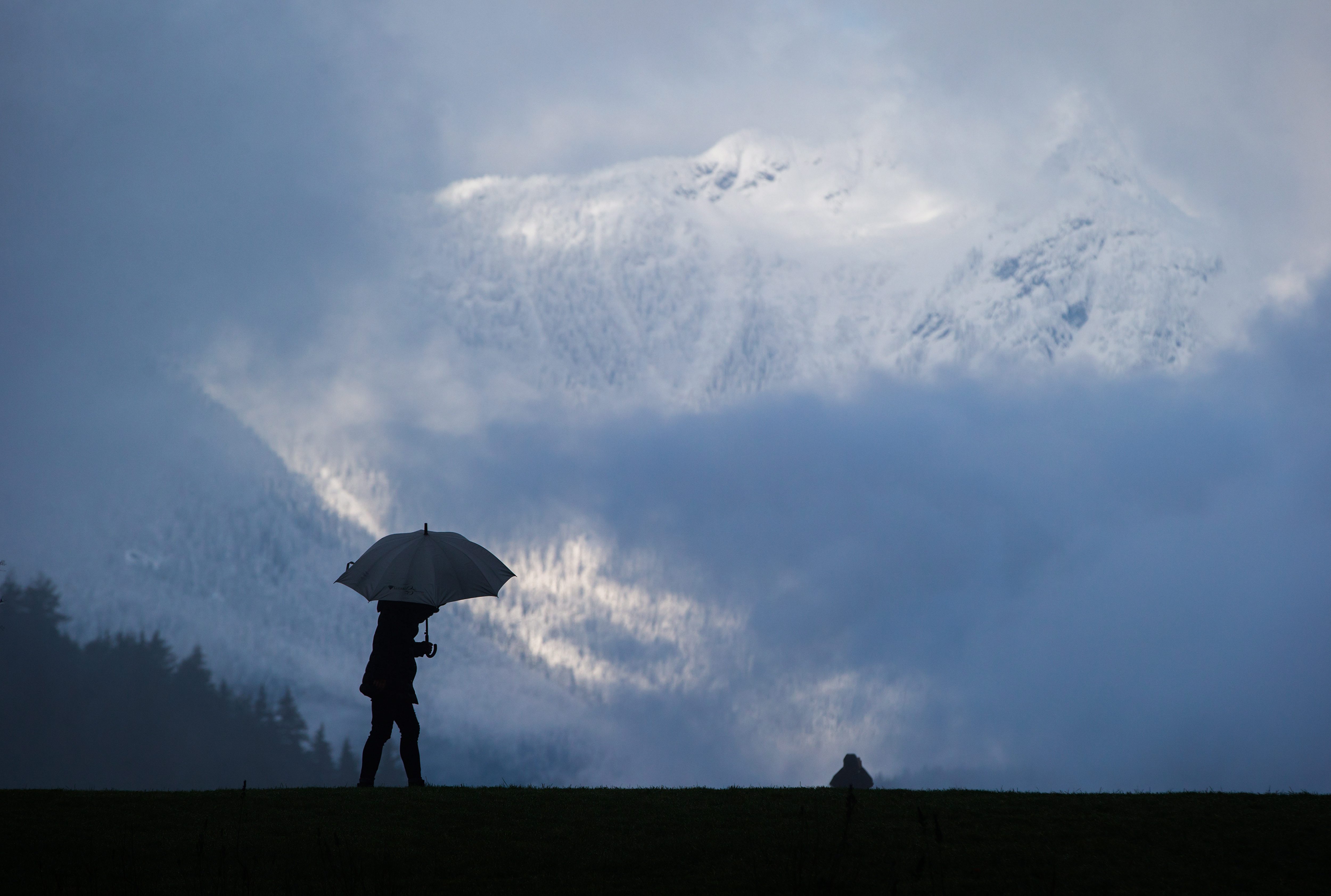 A woman with an umbrella is silhouetted as freezing rain and light snow fall at Cleveland Park in Vancouver, Canada, on Dec. 25, 2015. (Darryl Dyck/The Canadian Press via AP)