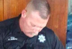 Reddit user colby979 posted a photo of a deputy sheriff sitting on the floor asleep with his head on his chest.